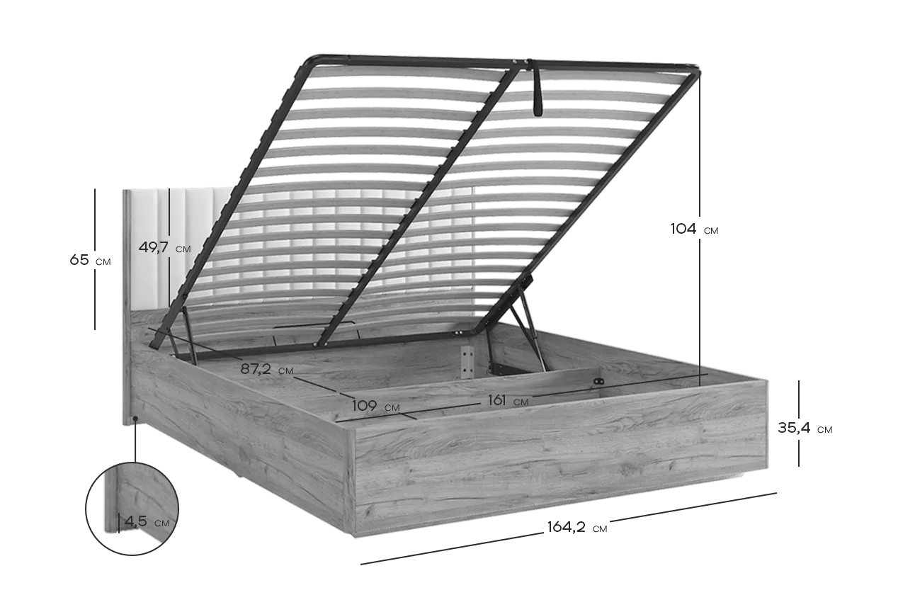 Она не только прекрасно выглядит, но и предлагает дополнительное место для хранения благодаря своему подъемному основанию. Для полноты комфорта учитывайте, что матрас и настил следует приобрести отдельно.