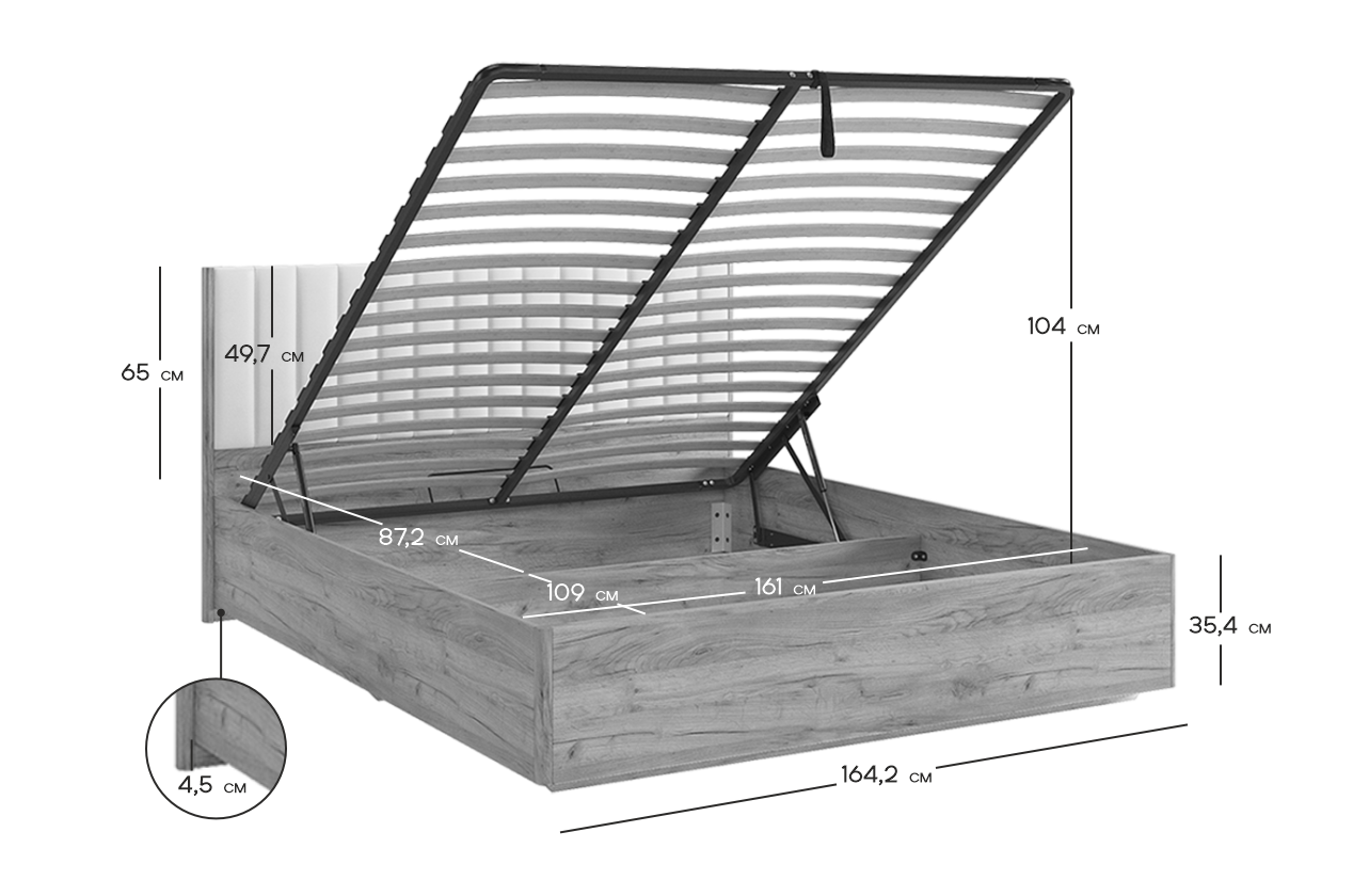 Она не только прекрасно выглядит, но и предлагает дополнительное место для хранения благодаря своему подъемному основанию. Для полноты комфорта учитывайте, что основание для кровати, матрас и настил следует приобрести отдельно.