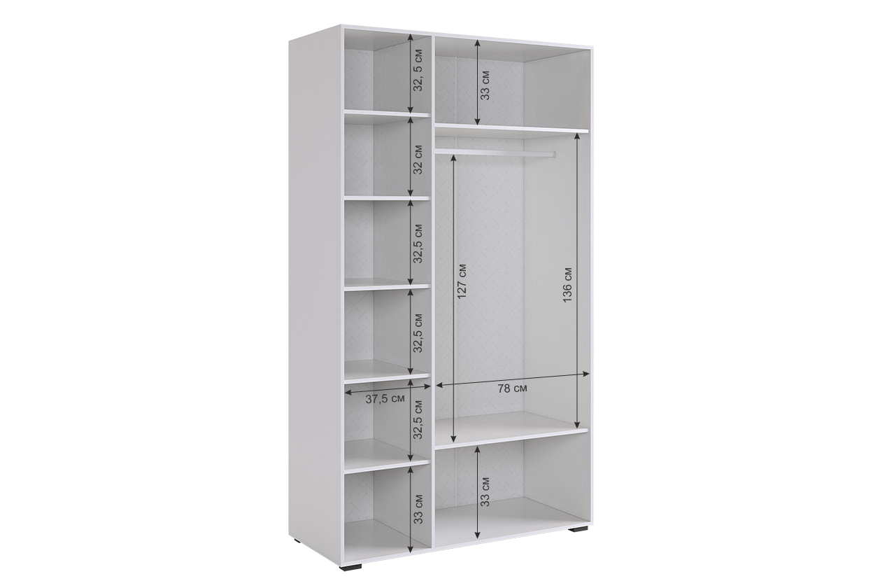 - Практичное наполнение: две секции, одна с штангой и двумя полками, вторая с пятью полками
