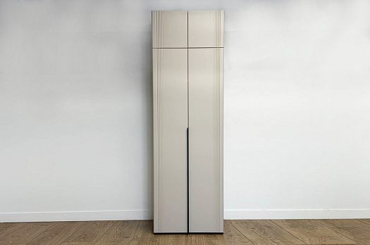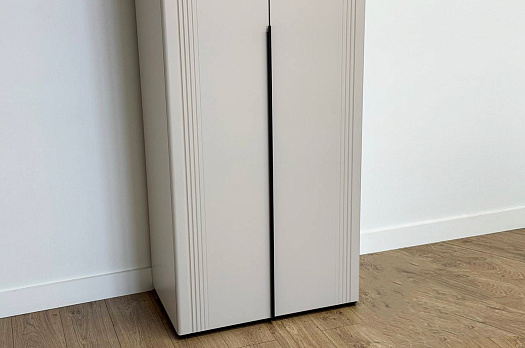 Корпус шкафа изготовлен из ЛДСП, что гарантирует прочность и долговечность. Фасады, выполненные из МДФ в плёнке ПВХ, не только выглядят эстетично, но и защищают шкаф от повреждений. Особое внимание заслуживает фрезеровка фасадов, которая придаёт шкафу изысканный вид.