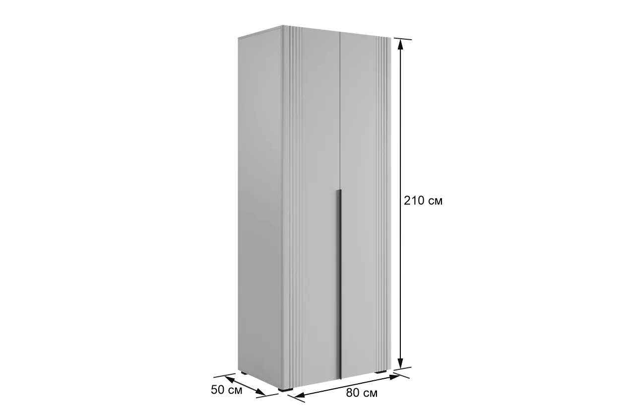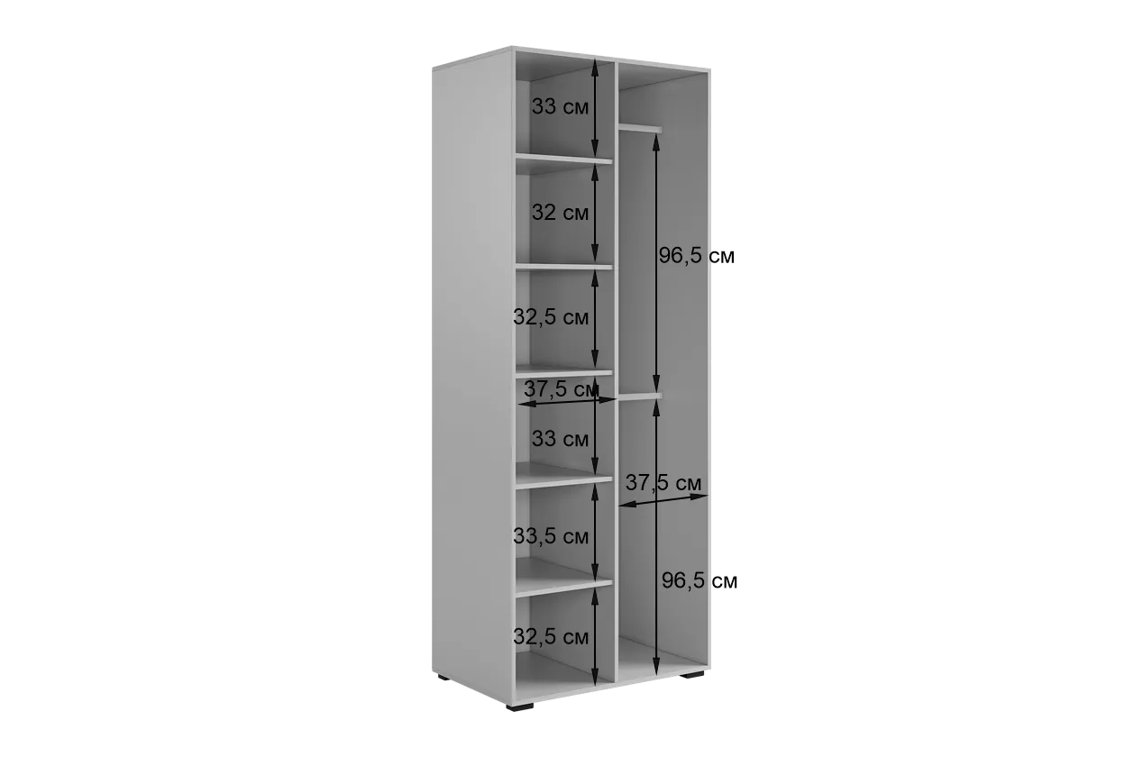 Шкаф оснащён длинными пластиковыми ручками и имеет удобное внутреннее наполнение: слева расположены полки, а справа — две штанги для вешалок. Это позволяет рационально использовать пространство и разместить различные типы одежды.