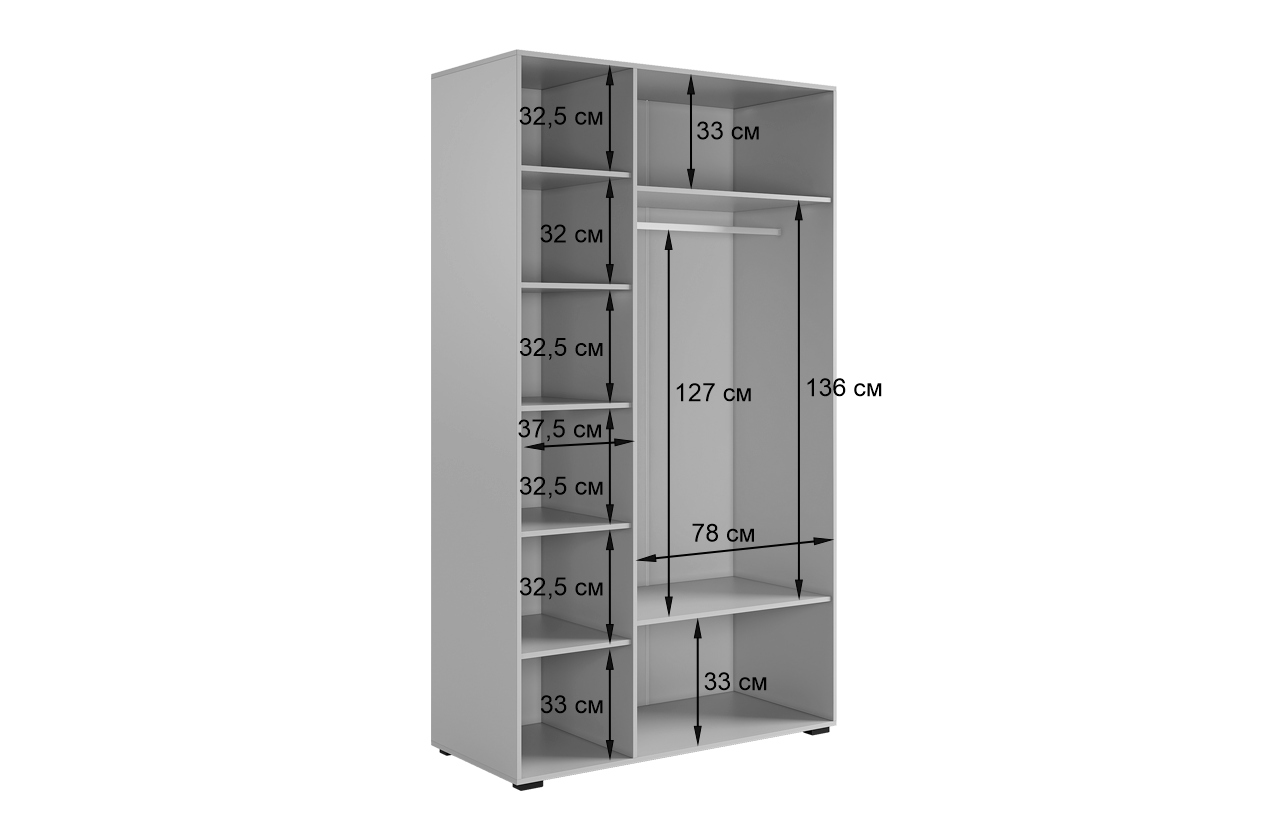 Шкаф имеет удобное наполнение: слева расположены полки для хранения вещей, а справа - штанга для вешалок. Это позволяет рационально использовать пространство и разместить различные типы одежды.
