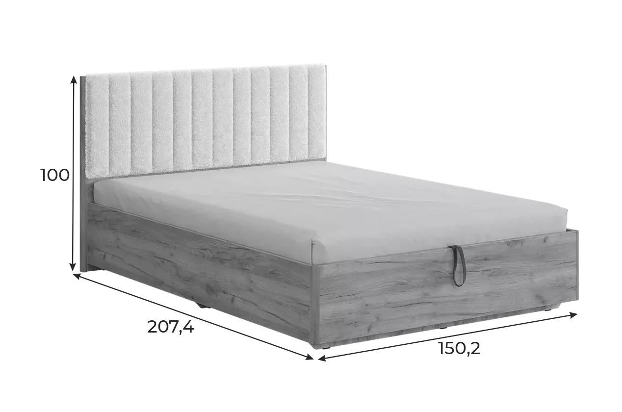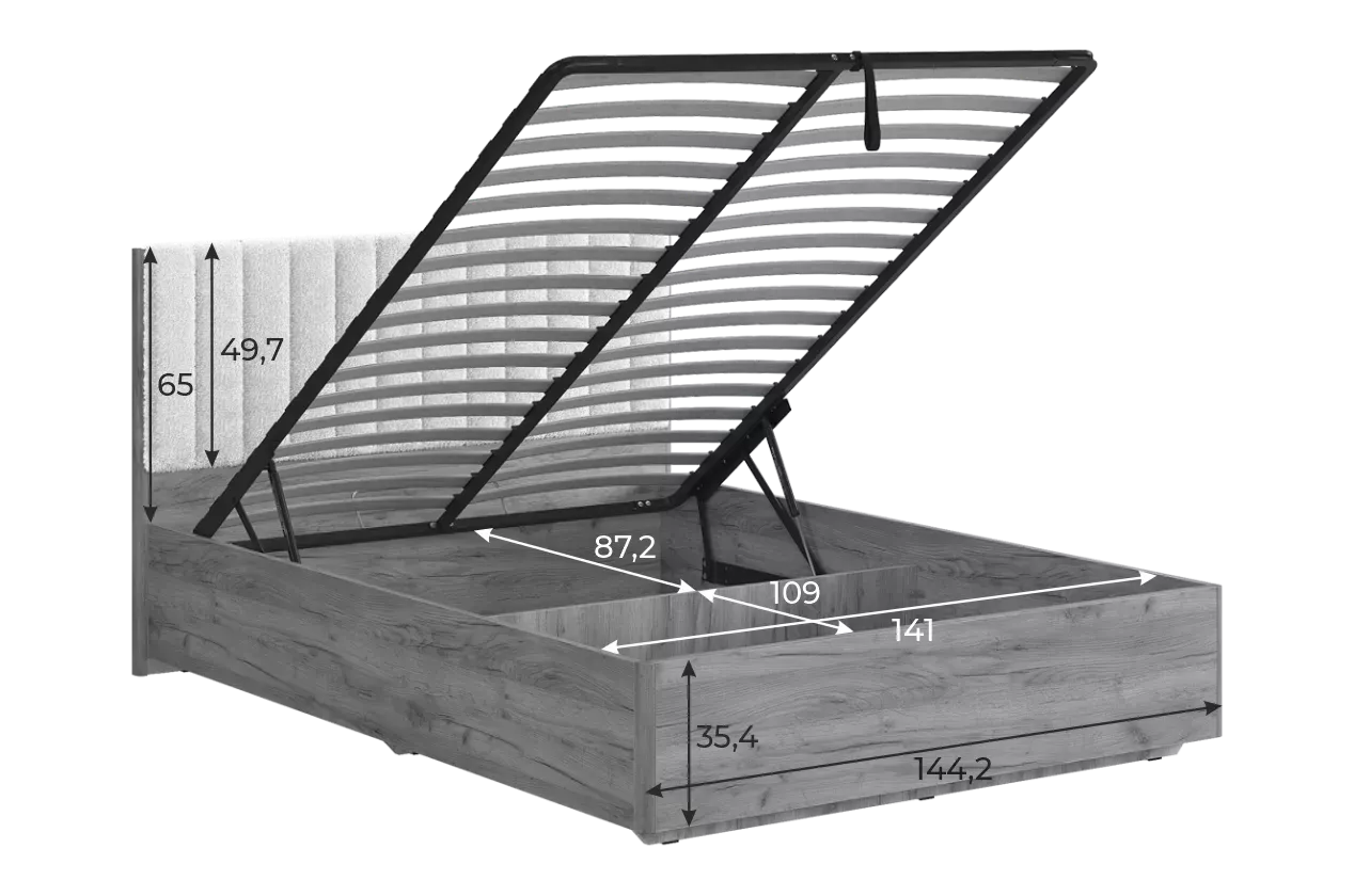 Состоит из: изголовья с мягким элементом, каркаса из ЛДСП и места спального с подъемным основанием..
