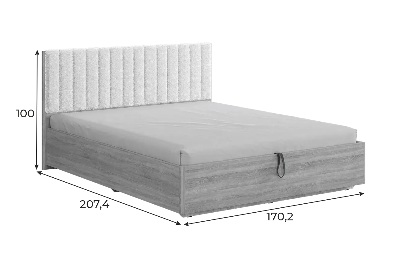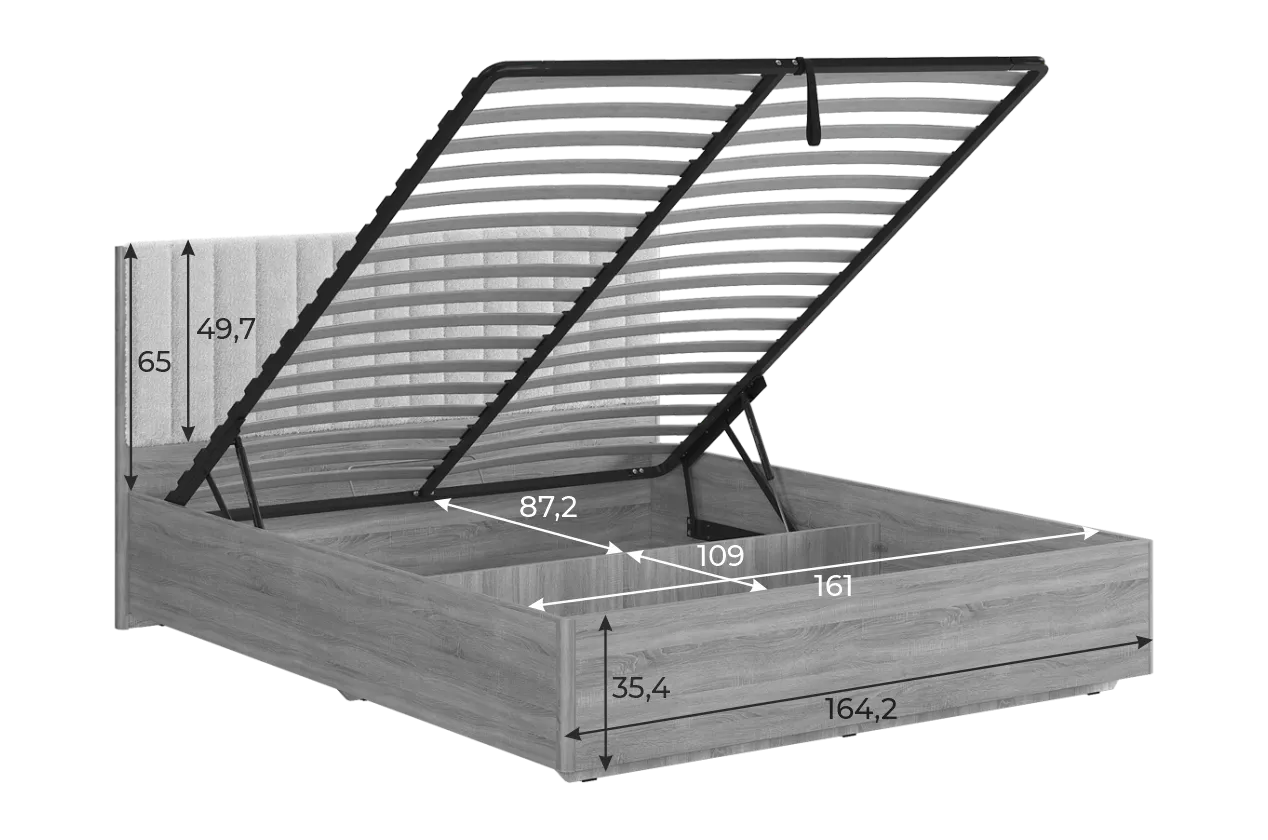 Состоит из: изголовья с мягким элементом, каркаса из ЛДСП и места спального с подъемным основанием..