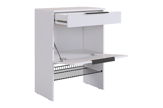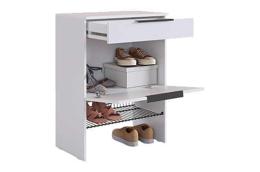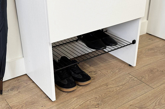 Изготовленная из прочного ЛДСП толщиной 16 мм, обувница обеспечивает надежность и долговечность. Выкатной ящик на шариковых направляющих позволяет легко и плавно открывать и закрывать его, предоставляя дополнительное место для хранения мелочей.