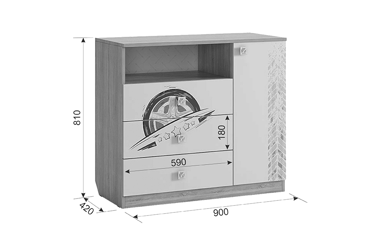 Детский комод Форсаж сочетает в себе стиль и практичность, идеально вписываясь в современный интерьер детской комнаты. Этот комод предлагает достаточно пространства для хранения с ящиками и полками за дверцей, где можно аккуратно разместить детские вещи. На верхней открытой полке удобно хранить игровые приставки, в то время как просторная столешница предназначена для установки телевизора.