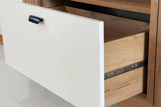 Тумба отлично сочетается со всеми модулями гостиной "Моди", а особенно с надстройкой "Моди".