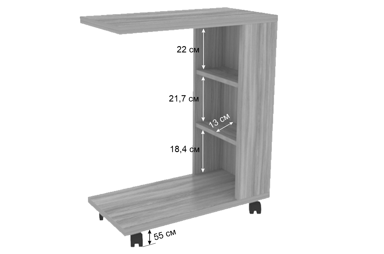 Состоит из: стола с 2-мя полками, на колесиках. Изделие симметричное.
