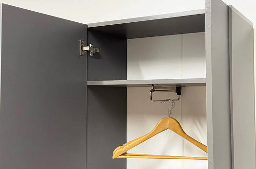 Шкаф оснащен накладными петлями с доводчиком от Боярд, которые обеспечивают плавное и бесшумное закрывание дверей. Выдвижная штанга предоставляет удобный доступ к одежде, позволяя легко организовать внутреннее пространство.