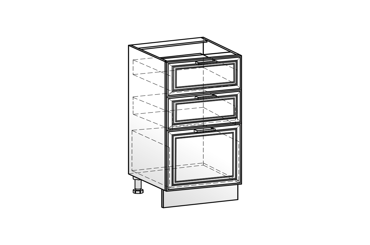 Состоит из:  шкаф рабочий с 3-мя выкатными ящиками  с системой выдвижения СТАРТ. Особенность системы - бесшумное плавное закрывание, встроенные доводчики, направляющие скрытые полного выдвижения. Нагрузка на ящик до 37,5кг.