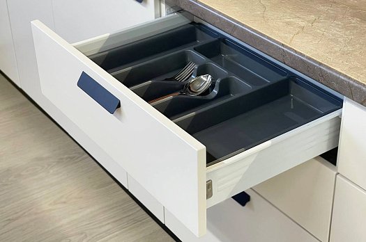 Дополнительно можно комплектовать: лотком для столовых приборов, столешницей, стеновой панелью, объемным плинтусом, стыковочными и торцевыми планками и цельным пластиковым цоколем на весь кухонный гарнитур.