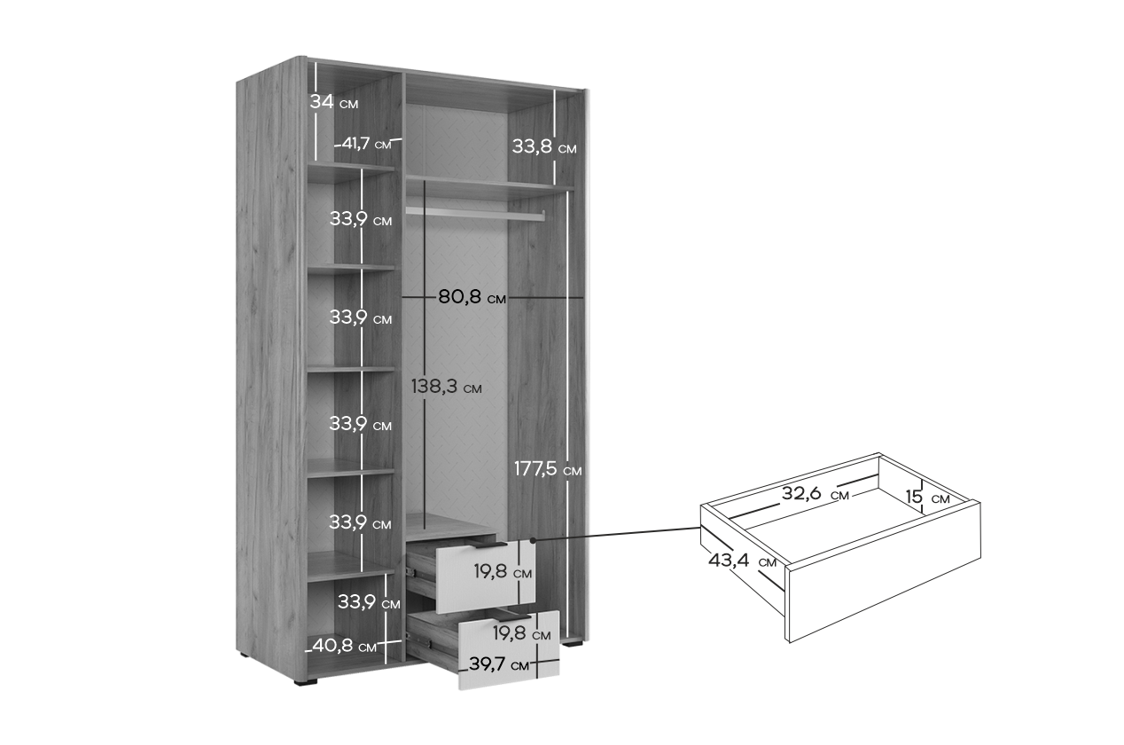 Состоит из: шести полок, двух ящиков выдвижных и штанги для одежды.