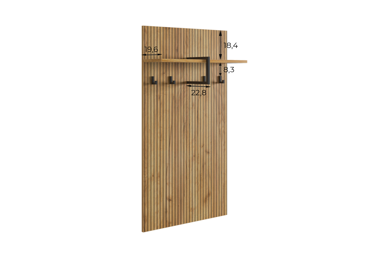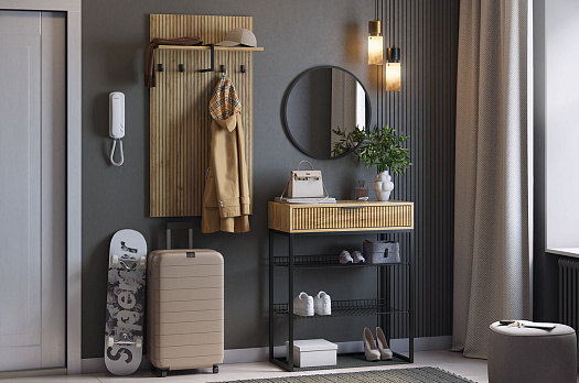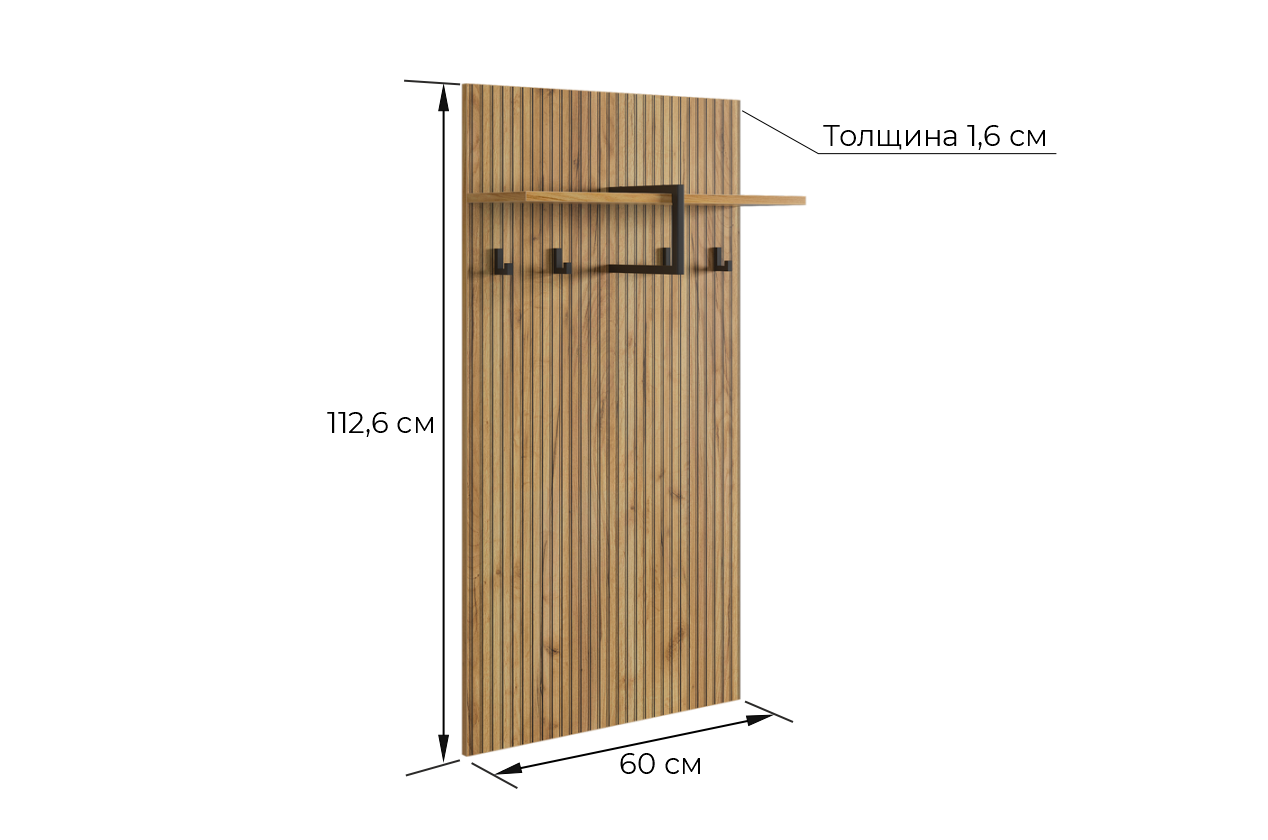 Принт, имитирующий вертикальную фрезеровку придает вешалке уникальный и современный вид, добавляя текстуру и глубину. Материал вешалки – ЛДСП, что обеспечивает прочность и долговечность, а также легкость в уходе.