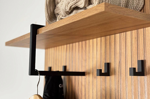 Крючки предоставляют удобное место для хранения верхней одежды, сумок или аксессуаров. Держатель для плечиков позволяет организовать хранение одежды, сохраняя ее в идеальном состоянии. Полка служит дополнительным пространством для хранения головных уборов.