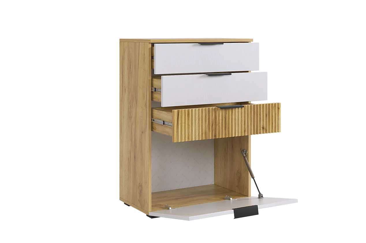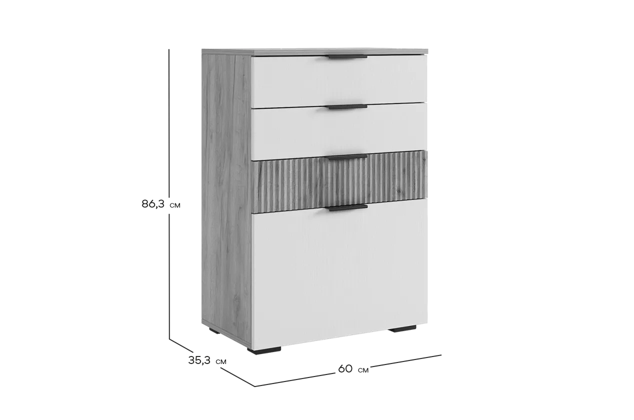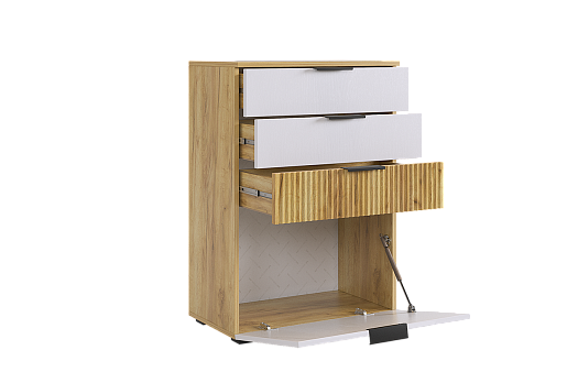 Покупал комод в дополнение к шкафу из той же серии "Бери". Цветовое решение идеально совпадает, получился гармоничный комплект. Комод компактный, но вместительный - 3 выдвижных ящика и закрытая секция позволяют разложить вещи по категориям. Направляющие качественные, ящики выдвигаются легко и бесшумно, закрытая секция - большая. Хорошее качество за разумную цену!