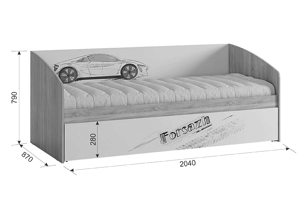 Дополнительное удобное спальное место или большой выдвижной ящик для хранения постельного белья и игрушек, на выбор, решать вам. Стильный принтерный рисунок на фасаде. Детская «Форсаж» - это стильная, современная детская, которая понравится каждому ребенку. Рисунок устойчив к истиранию и ультрафиолету.