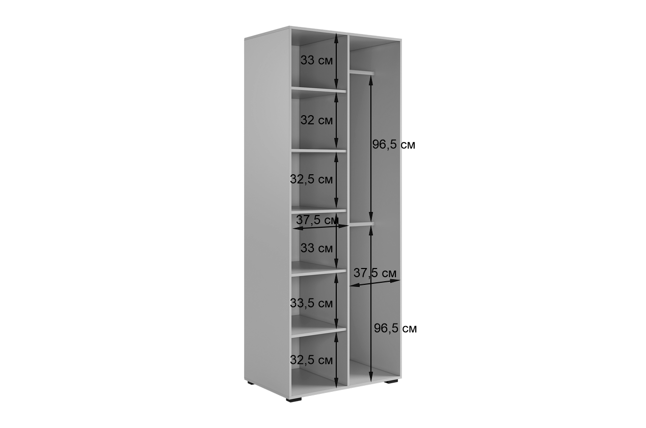 Шкаф оснащён длинными пластиковыми ручками и имеет удобное внутреннее наполнение: слева расположены полки, а справа — две штанги для вешалок. Это позволяет рационально использовать пространство и разместить различные типы одежды.