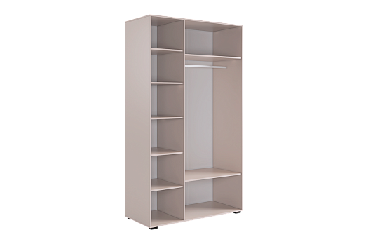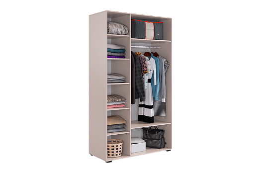 Шкаф имеет удобное наполнение: слева расположены полки для хранения вещей, а справа - штанга для вешалок. Это позволяет рационально использовать пространство и разместить различные типы одежды.