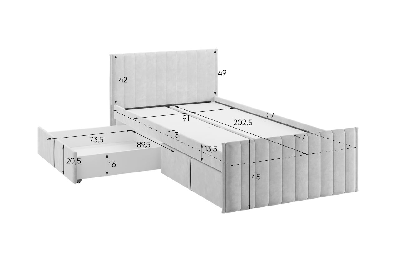Мягкая кровать "Твикс" – это сочетание комфорта, стиля и функциональности, идеально подходящее для современного интерьера. Мягкое изголовье обеспечивает дополнительную поддержку для спины во время чтения или отдыха. А мягкие корпус и фасады ящиков, обтянутые высококачественным велюром, создают уютную атмосферу и дополнительную безопасность Кровать оснащена удобными выкатными ящиками на роликах высотой Н30, что позволяет легко хранить игрушки, постельное белье или другие вещи, сохраняя порядок в комнате. Армированное основание из ЛДСП обеспечивает надежную поддержку матраса и гарантирует удобный сон.