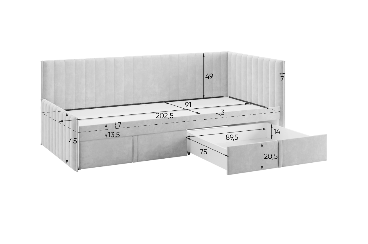 Корпус, изголовье и задняя боковина выполнены из прочного ДСП толщиной 16 мм, ППУ и велюра, что обеспечивает долговечность и надежность конструкции. Мягкие фасады выкатных ящиков, обтянутые благородной велюровой тканью, добавляют элемент роскоши и создают уютную атмосферу в комнате.